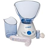 Give yourself a facial at home with this Conair facial spa. Gently steam open clogged pores and rejuvenate your skin. A narrow sinus cone helps clear nasal and sinus passages. There's a timer, automatic shutoff and a water cylinder for easy and accurate filling.Dual facial sauna cones: wide facial steamer and narrow sinus cone.Facial tool with gentle exfoliating brush and sponge for applying moisturizer.Safe automatic shutoff and timer to customize length of facial or nasal treatment.This unit can be used to steam open pores for cleansing skin and to steam open clogged nasal and sinus passages. The versatility comes from two translucent, blue, plastic cones. The large cone is 6-3/4 inches wide and has a flared, open side to accommodate the face, chin, and neck for cleansing. The small cone is 3-1/2 inches wide, so steam is directed into the nose where it can be breathed in during allergy and cold season. Operating the steamer is simple: using the included measuring tube, pour tap water into the power base's reservoir; twist on and lock into place either of the tubes; switch on the unit with the on/off button; and wait about three minutes for the water to heat. For controlled cleansing sessions there's a timer than can be set from 3 to 15 minutes. And for safety the unit automatically shuts off after 45 minutes. --Fred Brack Read more